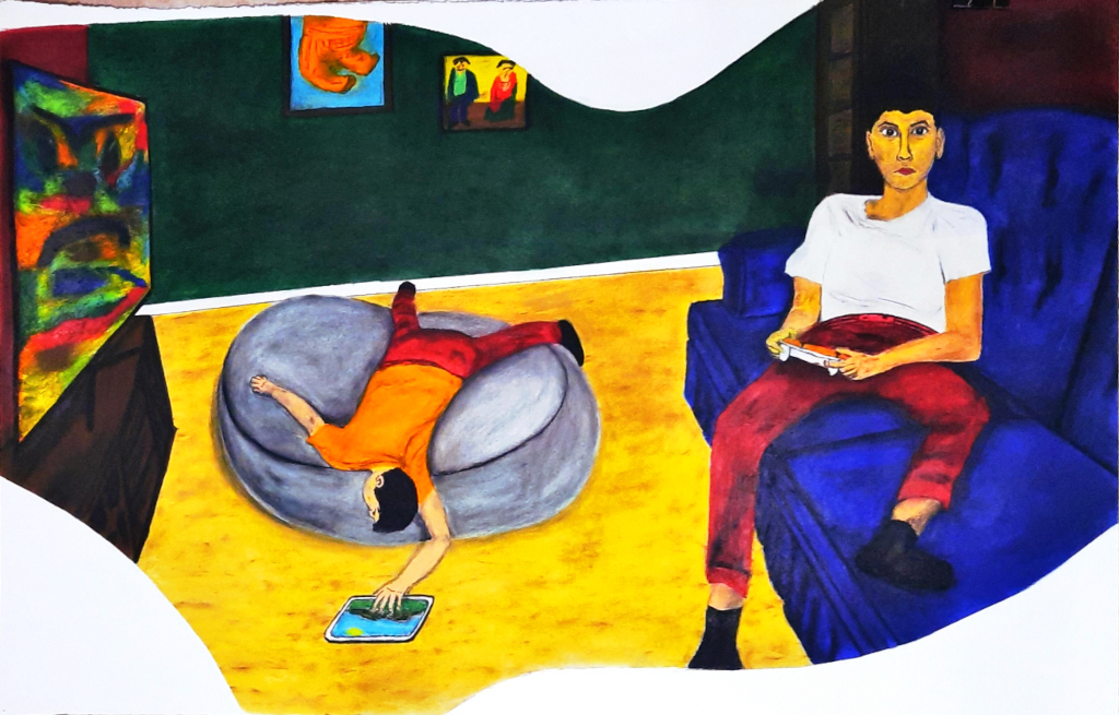 My Statement is simple: I make this painting based on what I see from my kids. Childhood in 2023 seems strange to me, with all the screens pointed at our kids like the parents they prefer. I look at them like strangers with this bizarre behavior on their hands and evil force: computers, tablets, or any screen.